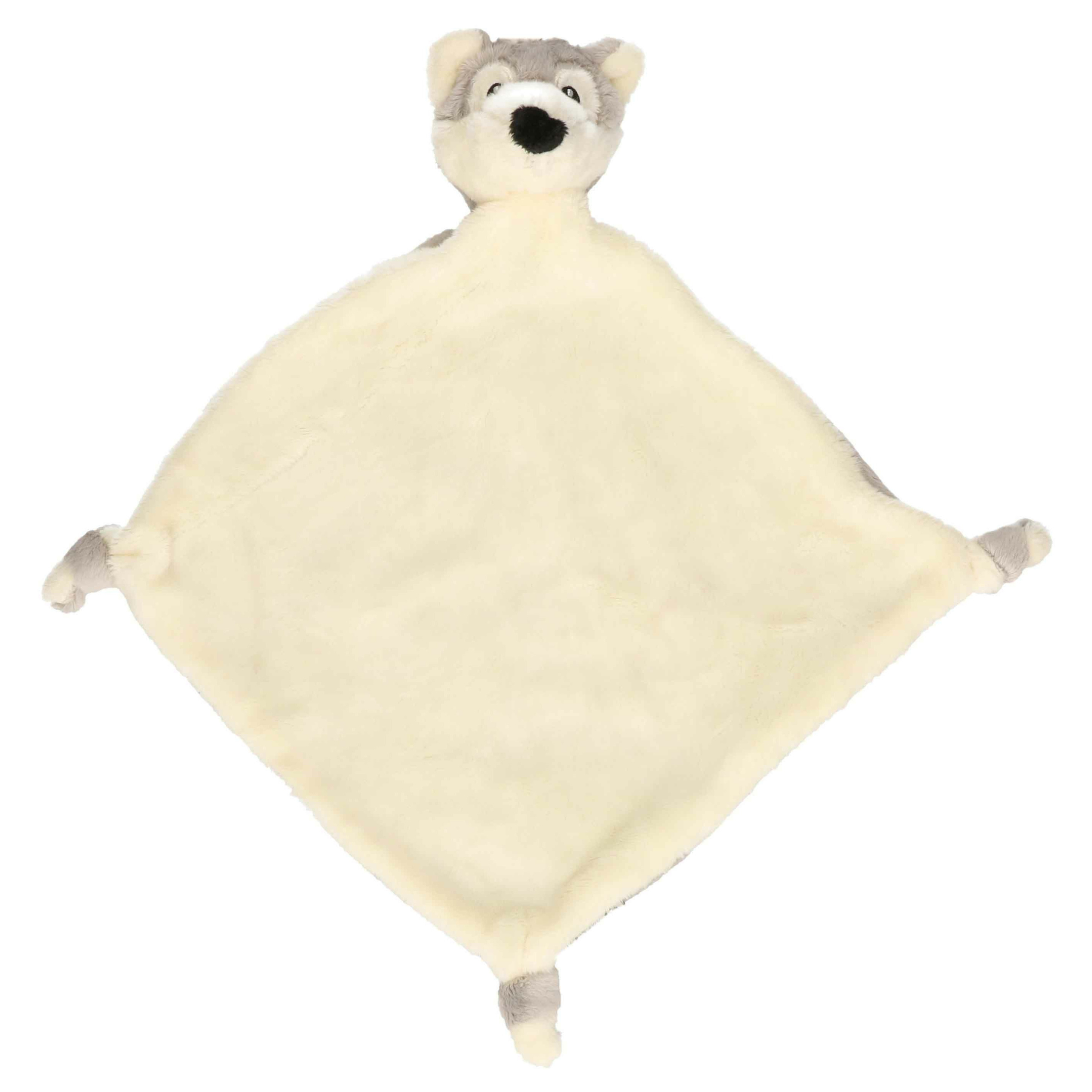 Wolf tuttel/knuffeldoekje 40 cm. Zacht knuffeldoekje met dierenhoofdje aan de bovenzijde. Formaat: 40 x 40 cm. Materiaal: polyester. Speelgoed wolven voor baby/peuters/kinderen. Kraamcadeaus knuffeltjes.
